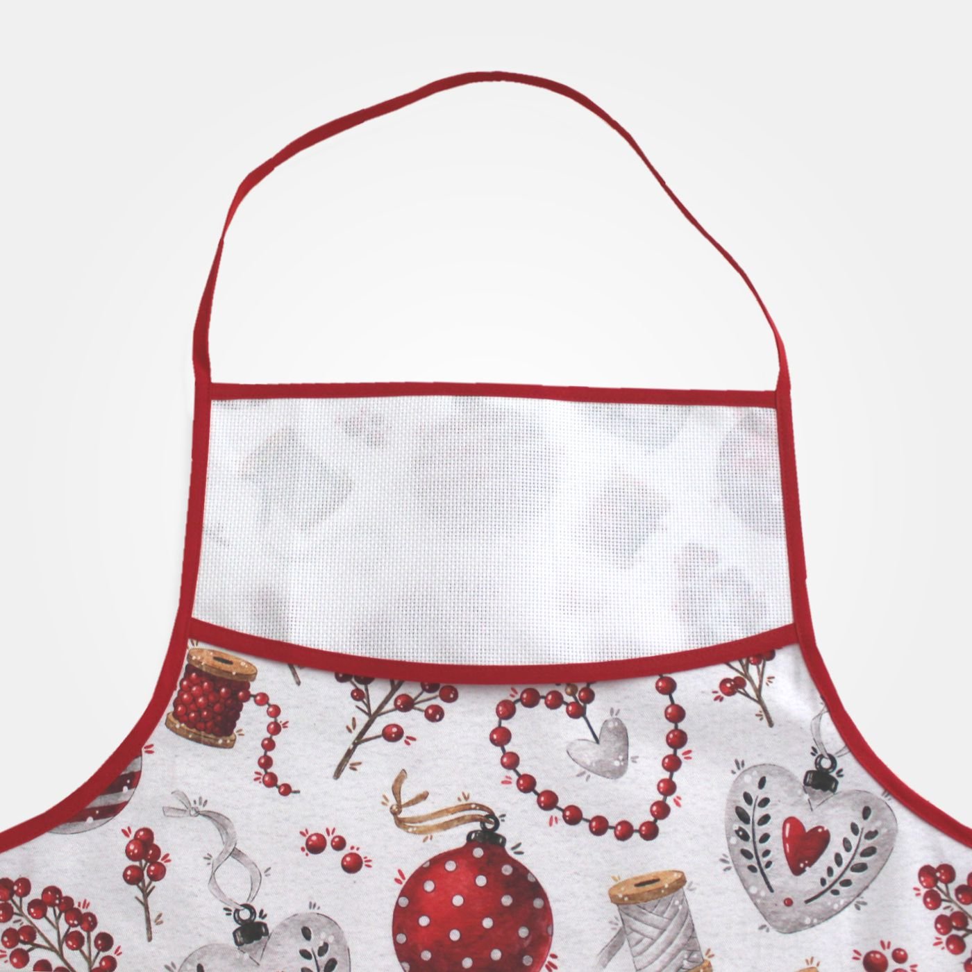 Grembiule intero da cucina in tessuto natalizio fantasia cuori Natalizi rossi, con tela Aida.