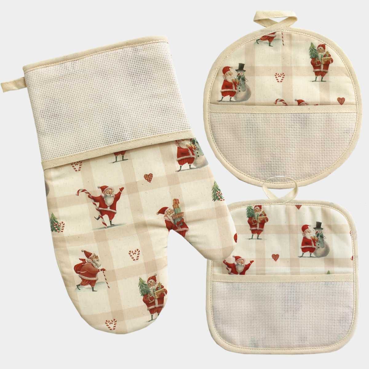 Set da forno composto da: 1 guantone e 2 presine (una tonda e una quadrata) in tessuto natalizio beige, fantasia Babbo Natale.