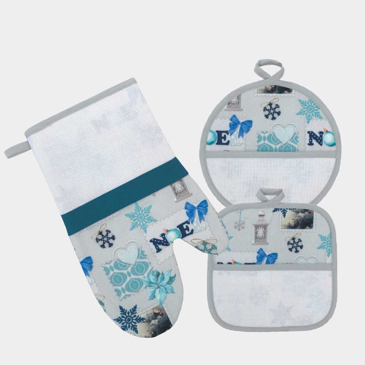 Set da forno composto da: 1 guantone e 2 presine (una tonda e una quadrata) in tessuto natalizio fantasia lanterne.