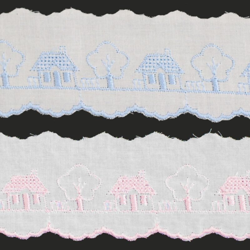 Elegante pizzo Sangallo bianco, impreziosito da delicati ricami in rilievo raffiguranti casette e alberelli, realizzati in filato colorato.