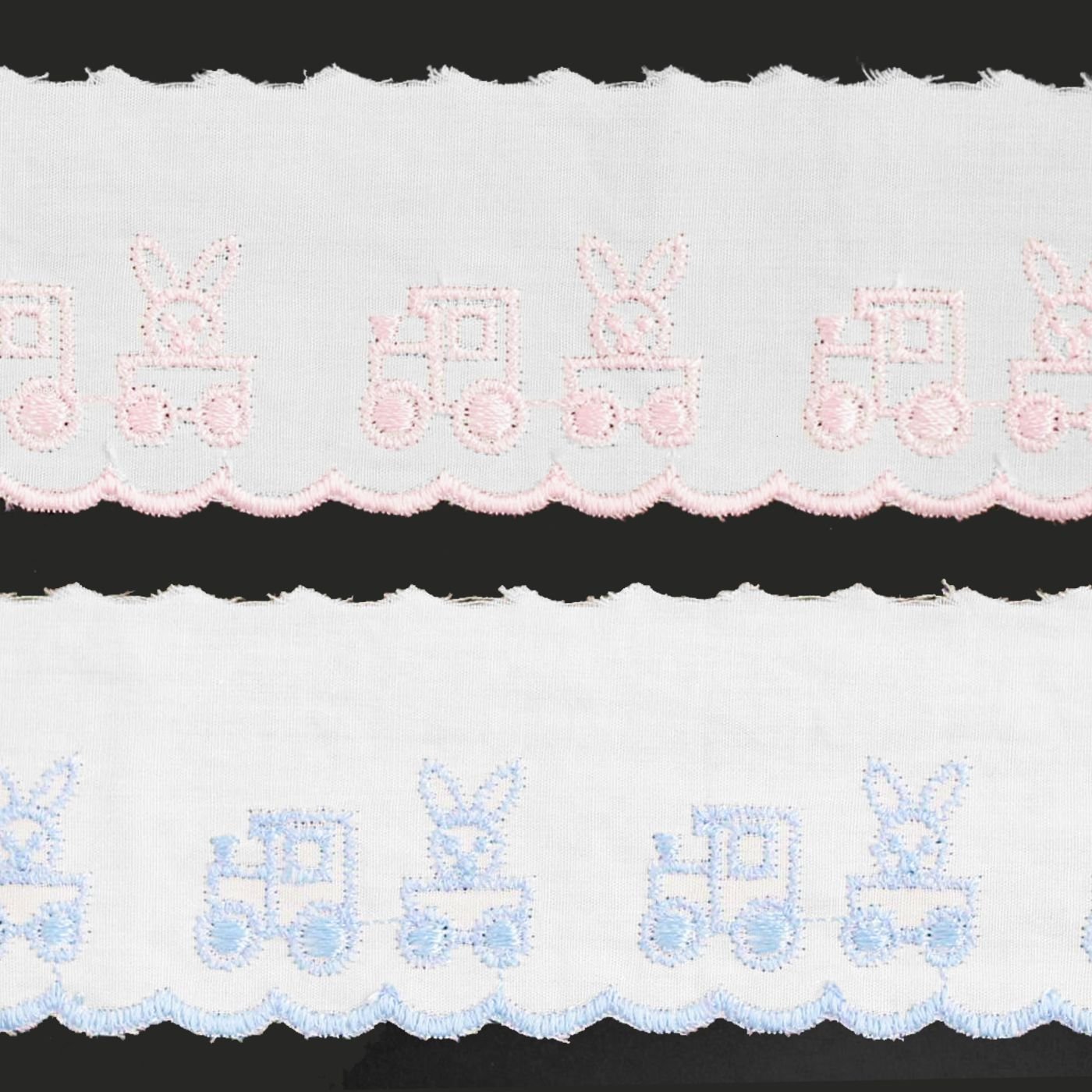 Elegante pizzo Sangallo bianco, impreziosito da delicati ricami in rilievo raffiguranti treno e coniglio, realizzati in filato colorato.