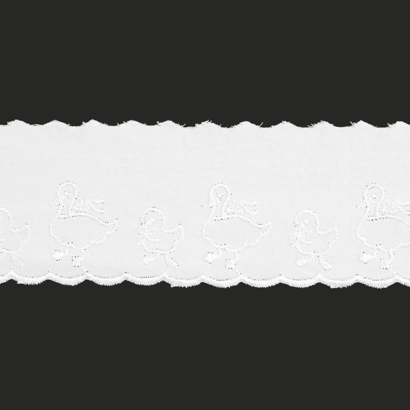 Elegante pizzo Sangallo bianco, impreziosito da delicati ricami in rilievo raffiguranti paperelle, realizzati in filato bianco lucido.